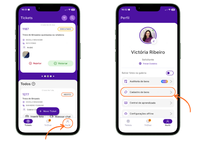 Abra o aplicativo e clique em “Perfil”. Em seguida, selecione a opção “Cadastro de Bens”.