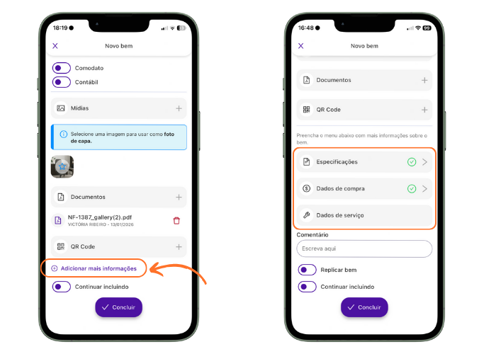 Você pode adicionar informações específicas do bem, como marca, modelo, dados de compra e dados de serviço. Basta clicar em “Adicionar mais informações“.