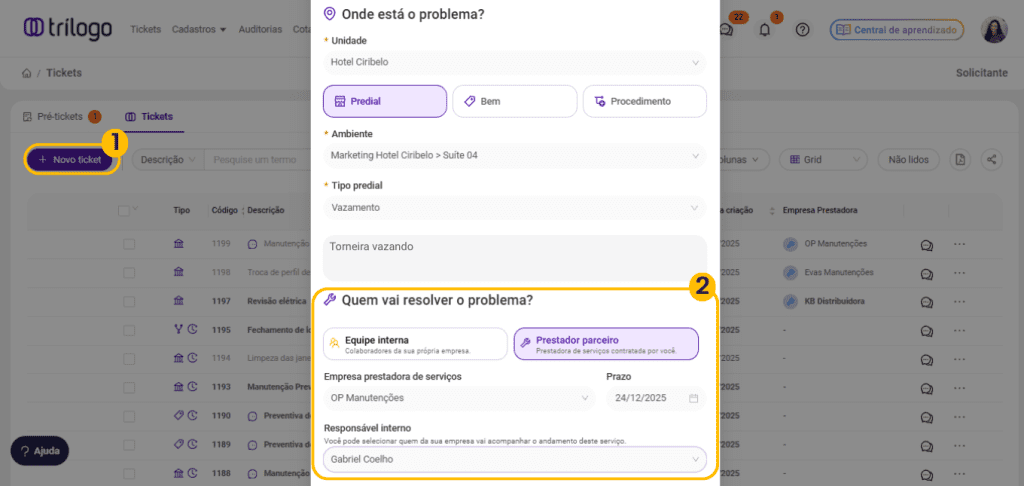 Acesse a página inicial do Trílogo e clique em “+ Novo Ticket”. Preencha as informações do chamado normalmente. Na aba “Quem vai resolver o problema?”, selecione o box “Prestador Parceiro” e selecione a empresa desejada. Você pode selecionar também um Responsável interno da sua própria empresa para acompanhar e se responsabilizar pela execução do chamado.