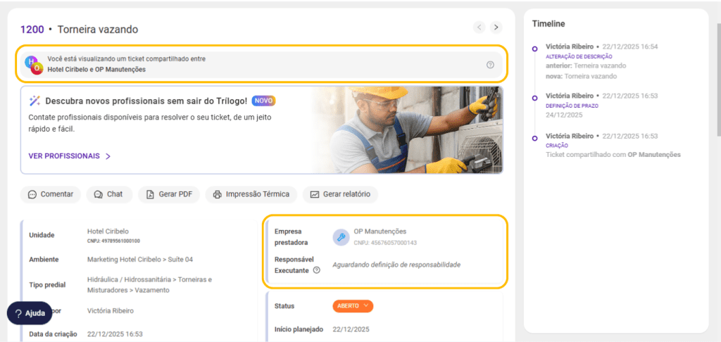 Agora seu ticket já está compartilhado com a empresa prestadora.