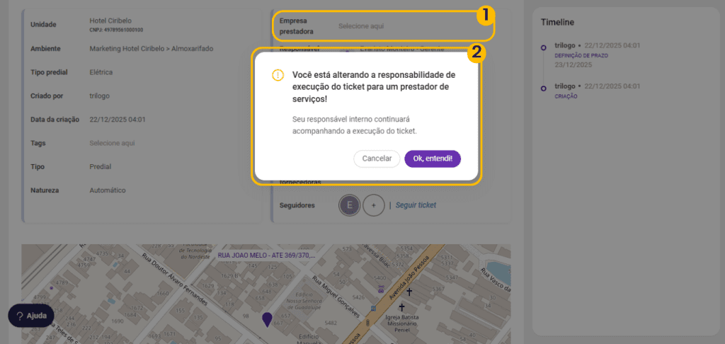Abra o ticket que será compartilhado, clique em “Empresa Prestadora”. Aparecerá o pop-up abaixo confirmando a ação, clique em “Ok, entendi” e selecione o prestador parceiro. Clique em “Finalizar”.