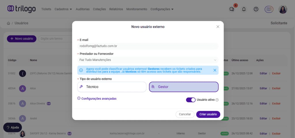 Cada pessoa tem um papel fundamental quando se trata de chamados de manutenção. No Trílogo, cada usuário tem seu perfil e suas funções bem definidas de acordo com o cadastro de usuário. Vamos aprender como cadastrar os seus usuários internos e externos?