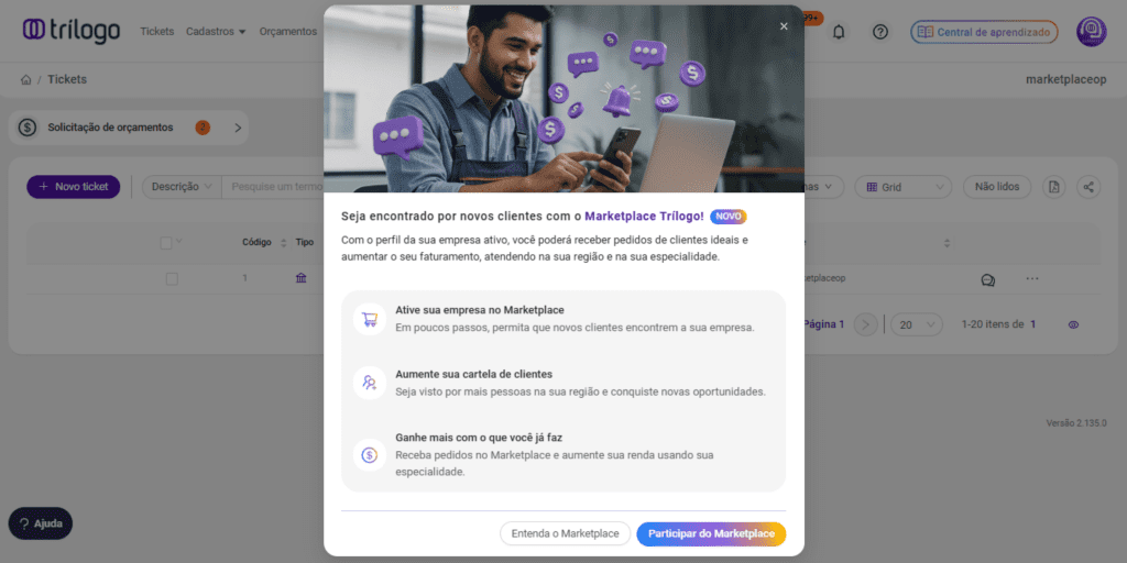 O Marketplace Trílogo chegou! Agora, empresas solicitantes que ainda não estão na sua cartela de clientes podem solicitar seus serviços de manutenção, de forma simples, organizada e focada em gerar novas oportunidades para o seu negócio.