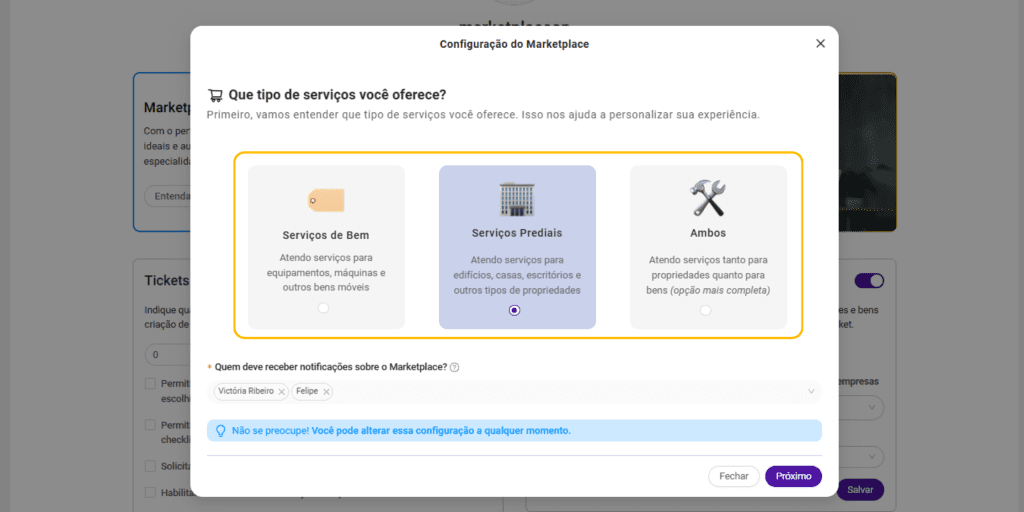 Essa definição é essencial para que sua empresa receba apenas chamados compatíveis com a sua atuação. Selecione também o usuário que será responsável por receber e acompanhar as solicitações de orçamento enviadas via Marketplace. Isso garante agilidade no atendimento e evita que oportunidades sejam perdidas.