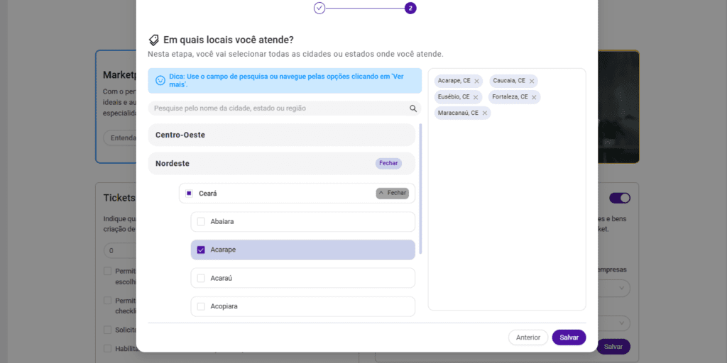 Por fim, selecione com atenção as cidades onde sua empresa atua. O Marketplace prioriza prestadores próximos às empresas solicitantes, então essa etapa é fundamental para aumentar suas chances de ser encontrado.