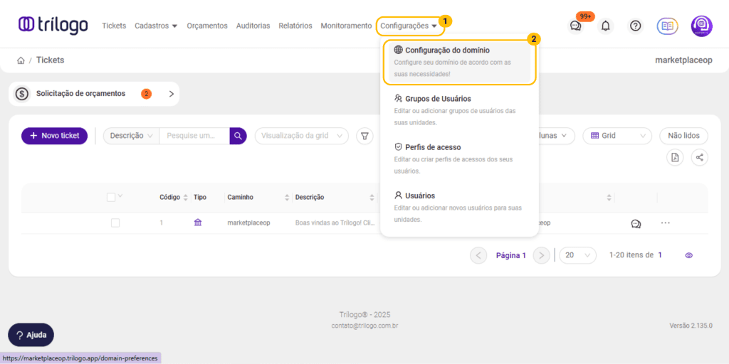 Com essas etapas concluídas, sua empresa já estará visível no Marketplace Trílogo e apta a receber solicitações de orçamento de empresas solicitantes. Você pode editar essas informações a qualquer momento fazendo o mesmo caminho anterior: “Menu cadastros > Configurações de domínio”.