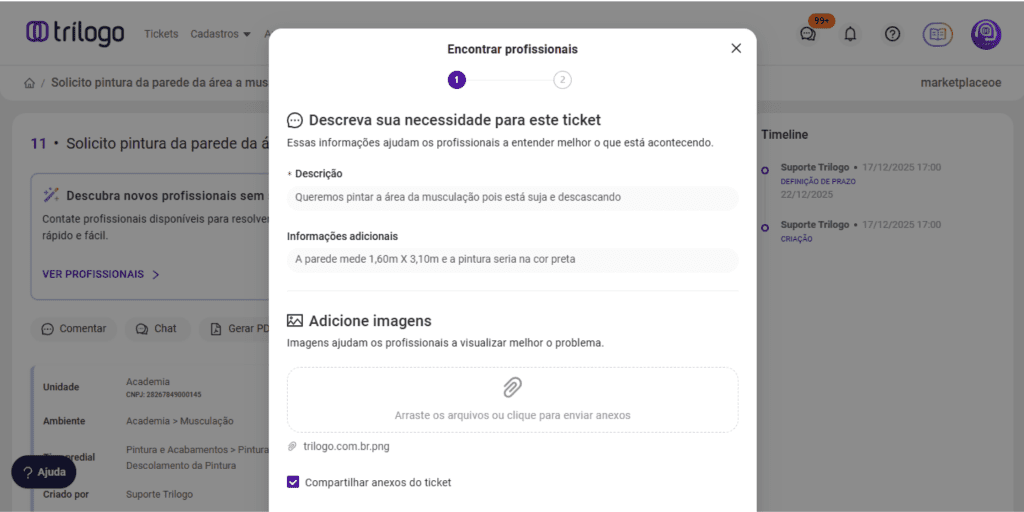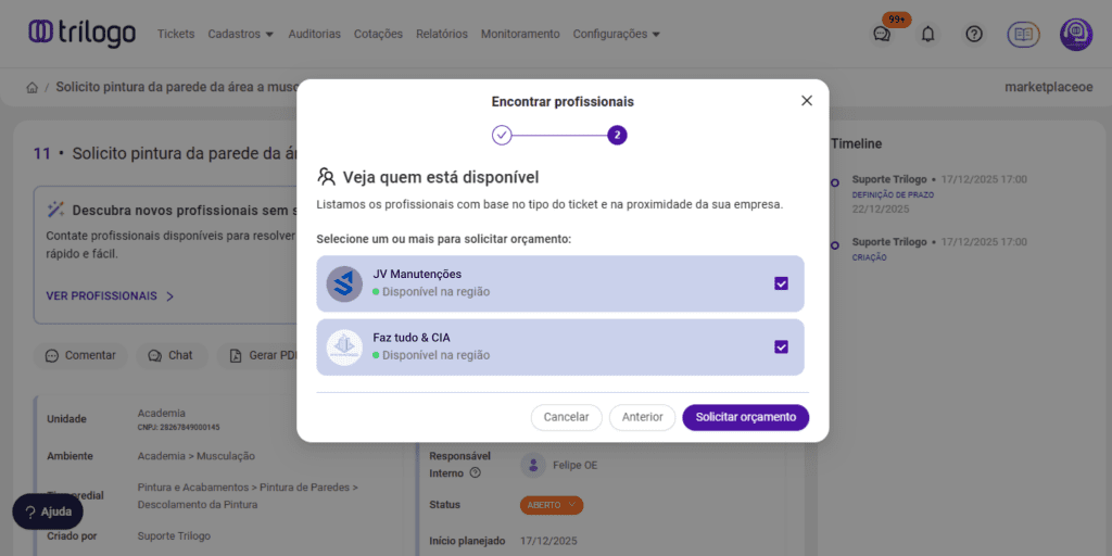 Agora, ao abrir um ticket de manutenção predial ou de bens no Trílogo, é possível consultar se há prestadores disponíveis que atendem essa demanda próximos à região da unidade.