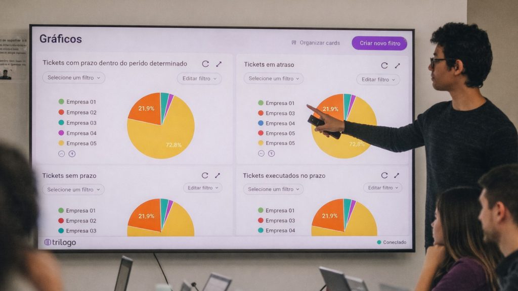 A Trílogo simplifica esse processo, centralizando desde a abertura de chamados até a geração de relatórios estratégicos que sua diretoria sempre quis ver, sem a complexidade de sistemas industriais pesados.