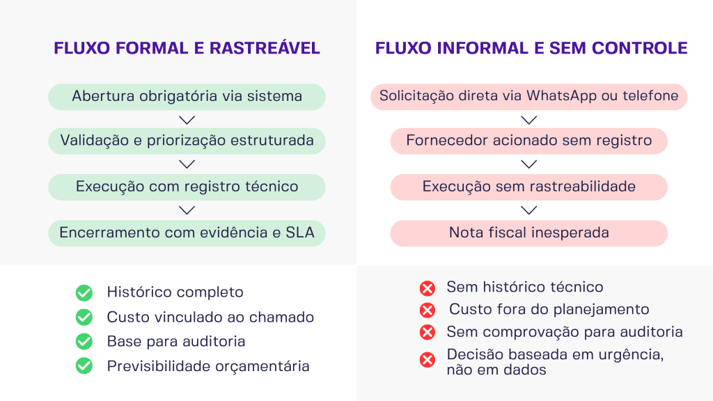 O serviço é feito, a lâmpada é trocada ou o vazamento estancado. A nota fiscal chega dias depois e, surpresa: o orçamento do mês já foi comprometido. Esse é o custo dos chamados informais. Ele pode não aparecer na sua tela de gestão hoje, mas certamente aparecerá como um desvio orçamentário doloroso no fim do trimestre.